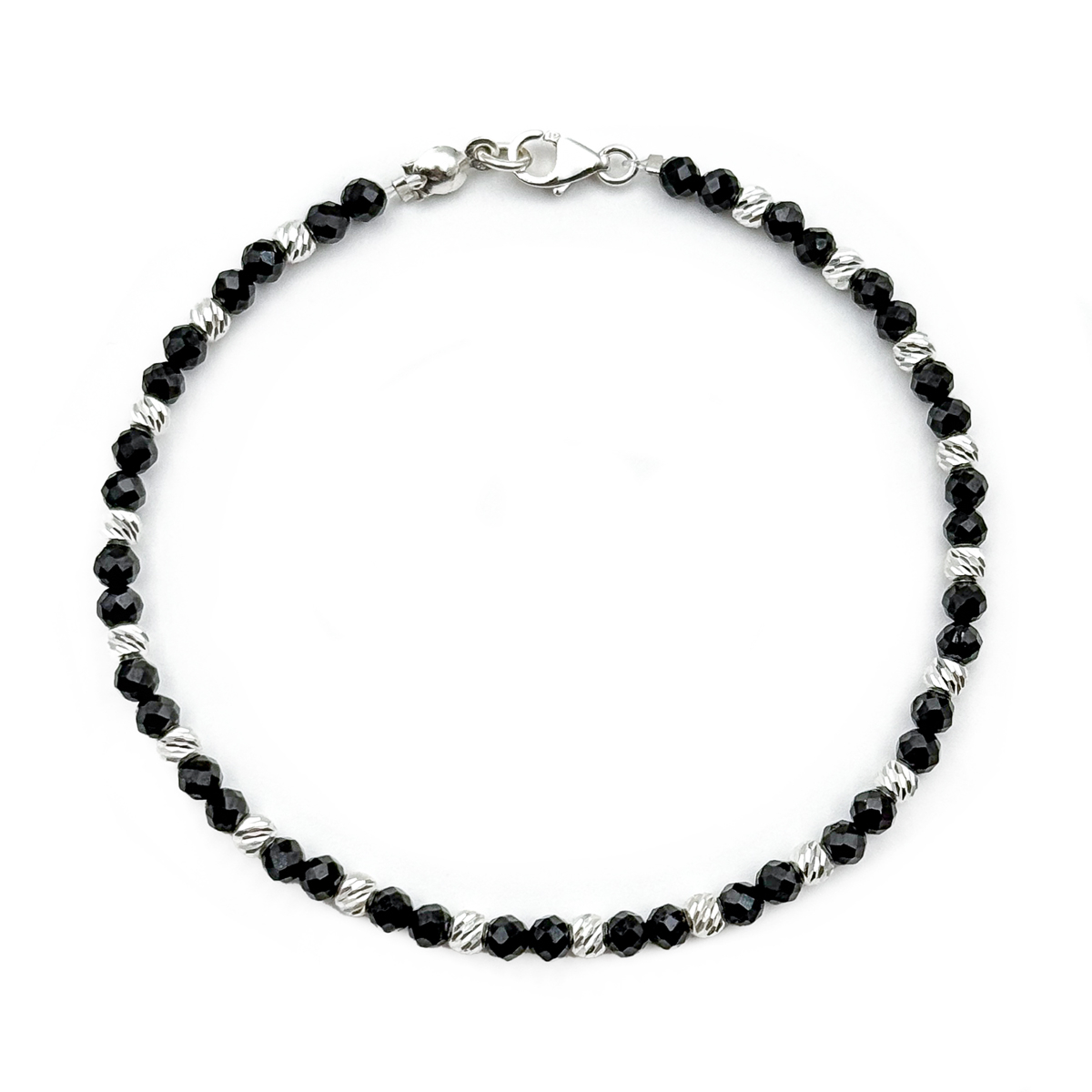 Bratara realizata manual din pietre semipretioase spinel si bilute din argint 925, montata pe fir rezistent de nylon si prevazuta cu sistem de inchidere din argint 925. Combina rafinamentul discret cu durabilitatea. Spinelul negru simbolizeaza protectia si puterea interioara, fiind o alegere perfecta pentru purtare zilnica sau ca dar special.