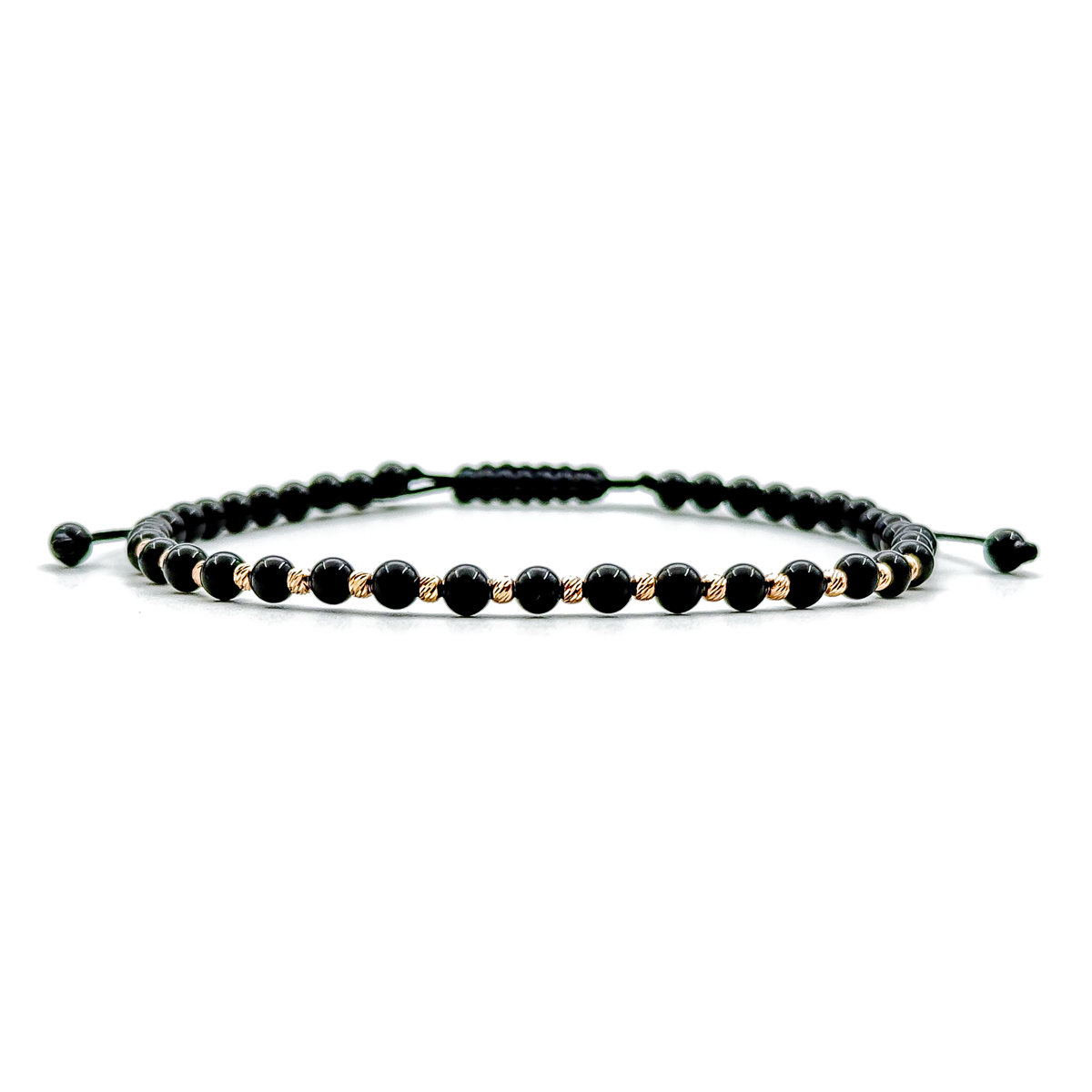 Bratara Velar confectionata manual in propriul atelier cu bile din aur de 14k, pietre semipretioase onix si snur acoperit cu ceara pentru o durabilitate maxima. Complet reglabila pentru o potrivire perfecta.