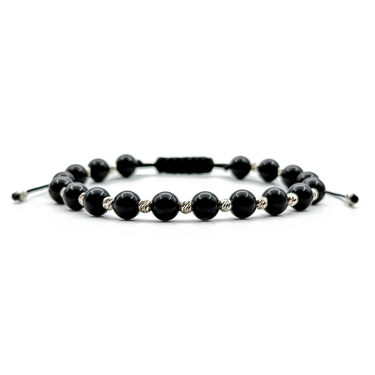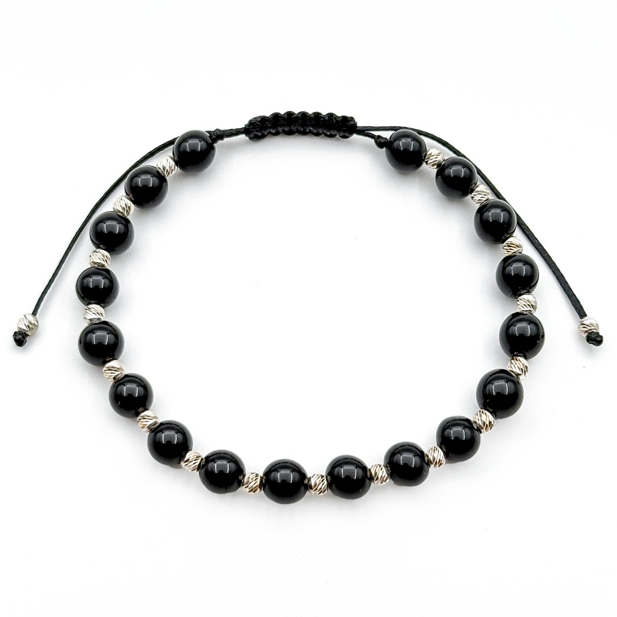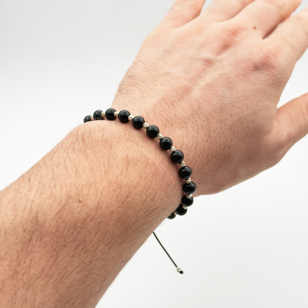 Bratara Velar confectionata manual in propriul atelier cu bile din argint 925, pietre semipretioase onix si snur acoperit cu ceara pentru o durabilitate maxima. Complet reglabila pentru o potrivire perfecta.