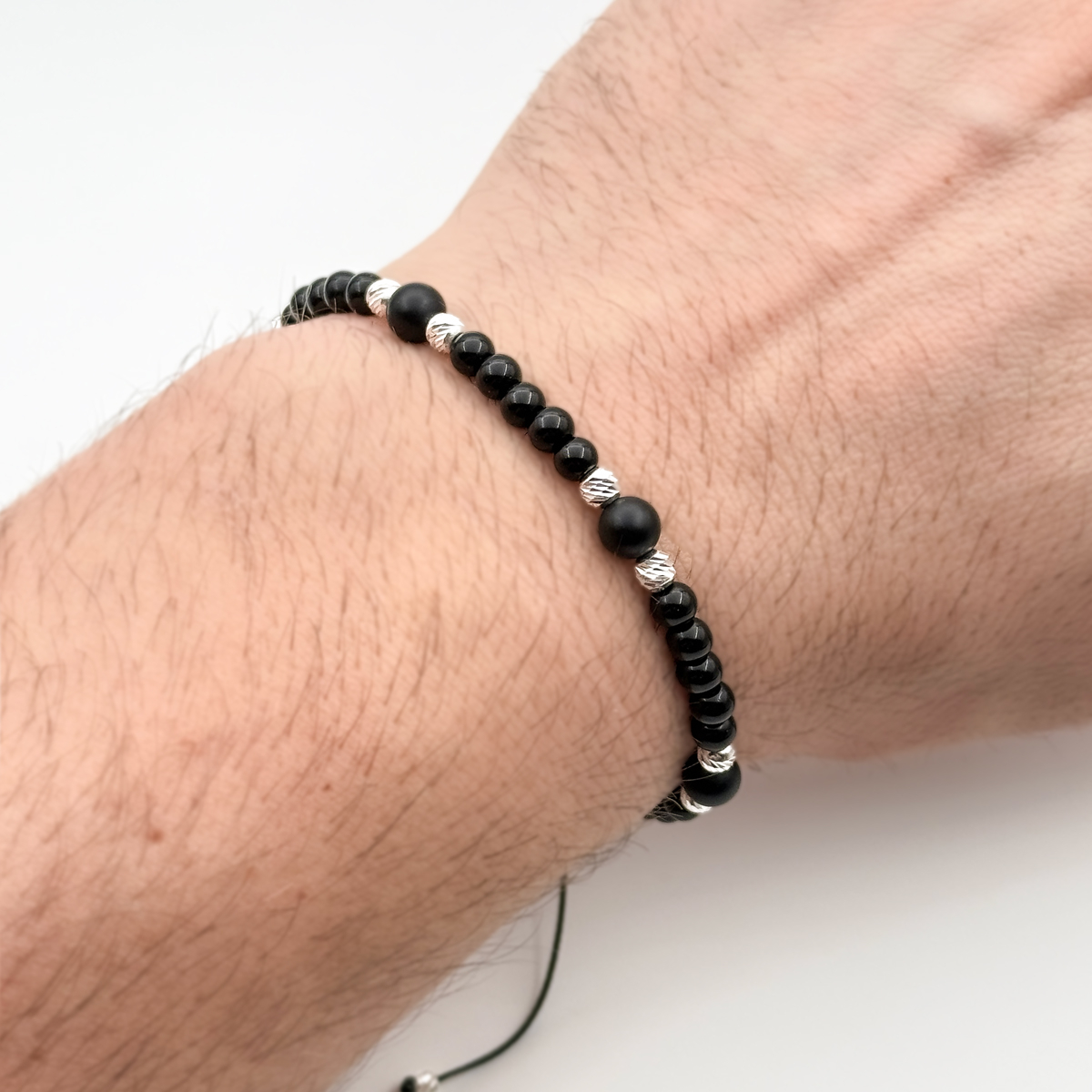 Featuring a striking blend of onyx natural stones and 925 sterling silver, each bracelet is fully adjustable for the perfect fit and hand-crafted using wax-coated polyester thread for ultimate durability.